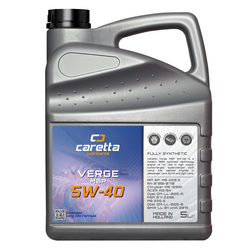 Caretta Verge MBP 5W-40 is a modern 100% synthetic technology engine oil for use in high output, turbocharged, supercharged multi valve fuel injected engines in passenger cars, SUVs and light vans.