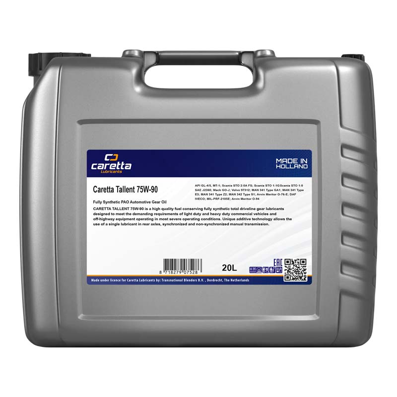 Caretta Tallent 75W-90 is a high quality fuel conserving fully synthetic total driveline gear lubricants designed to meet the demanding requirements of light duty and heavy duty commercial vehicles and off-highway equipment operating in most severe operating conditions. Unique additive technology allows the use of a single lubricant in rear axles, synchronized and non-synchronized manual transmission.