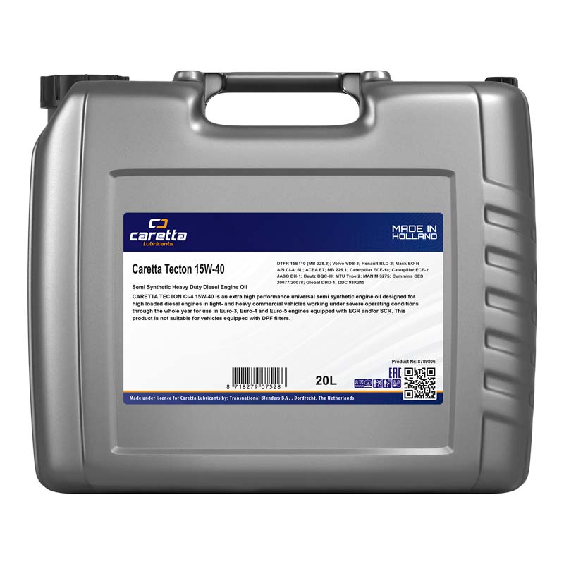 Caretta Tecton CI-4 15W-40 is an extra high performance universal semi synthetic engine oil designed for high loaded diesel engines in light- and heavy commercial vehicles working under severe operating conditions through the whole year for use in Euro-3, Euro-4 and Euro-5 engines equipped with EGR and/or SCR. This product is not suitable for vehicles equipped with DPF filters.