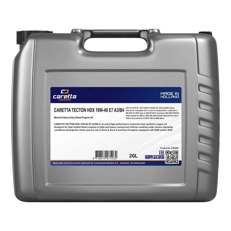 Caretta Tecton HDX 10W-40 E7 A3/B4 is an extra high performance universal semi synthetic engine oil designed for high loaded diesel engines in light- and heavy commercial vehicles working under severe operating conditions through the whole year for use in Euro-3, Euro-4 and Euro-5 engines equipped with EGR and/or SCR. This product is not suitable for vehicles equipped with DPF filters.