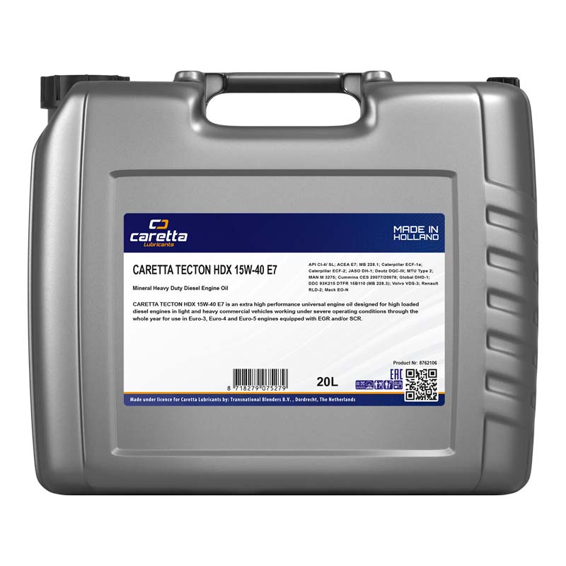 Caretta Tecton HDX 15W-40 E7 is an extra high performance universal engine oil designed for high loaded diesel engines in light- and heavy commercial vehicles working under severe operating conditions through the whole year for use in Euro-3, Euro-4 and Euro-5 engines equipped with EGR and/or SCR. This product is not suitable for vehicles equipped with DPF filters.
