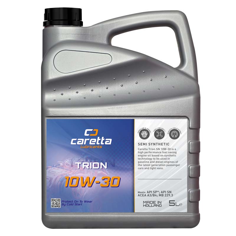 Caretta Trion SN 10W-30 is a high performance fuel saving engine oil based on synthetic technology to be used in gasoline and diesel engines of the latest generation passenger cars and light vans.